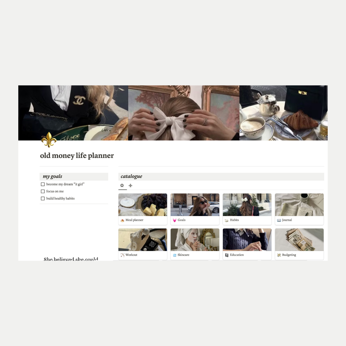 Meet the Old Money Life Planner Notion Template—the ultimate tool for transforming your planning and productivity into an art form. Carefully designed for the busy multitasker, this practical aesthetic life planner is perfect for those looking to inspire and achieve their vision!